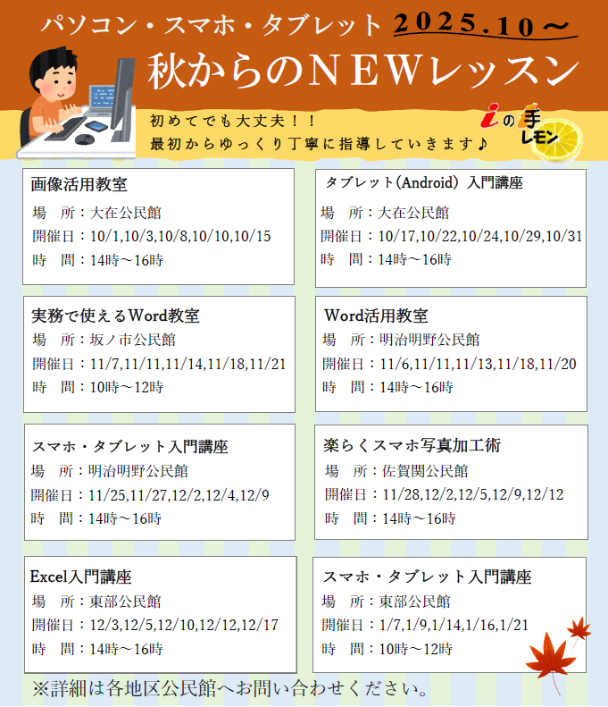 iの手レモンの活動としては、10月1日の大在公民館での「画像活用教室」を皮切りに、各地の公民館にてスマホ・タブレット・パソコンの教室・講座を行っていきます。