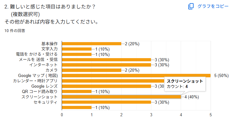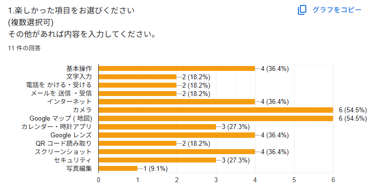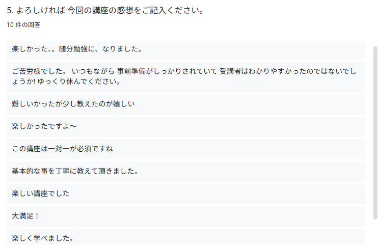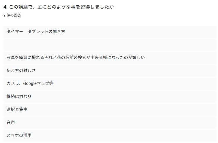 今回はスマタブ講座専用の試作段階のフォームでしたが、受講者の皆さんが答えやすいように選択肢を多く設定しました。